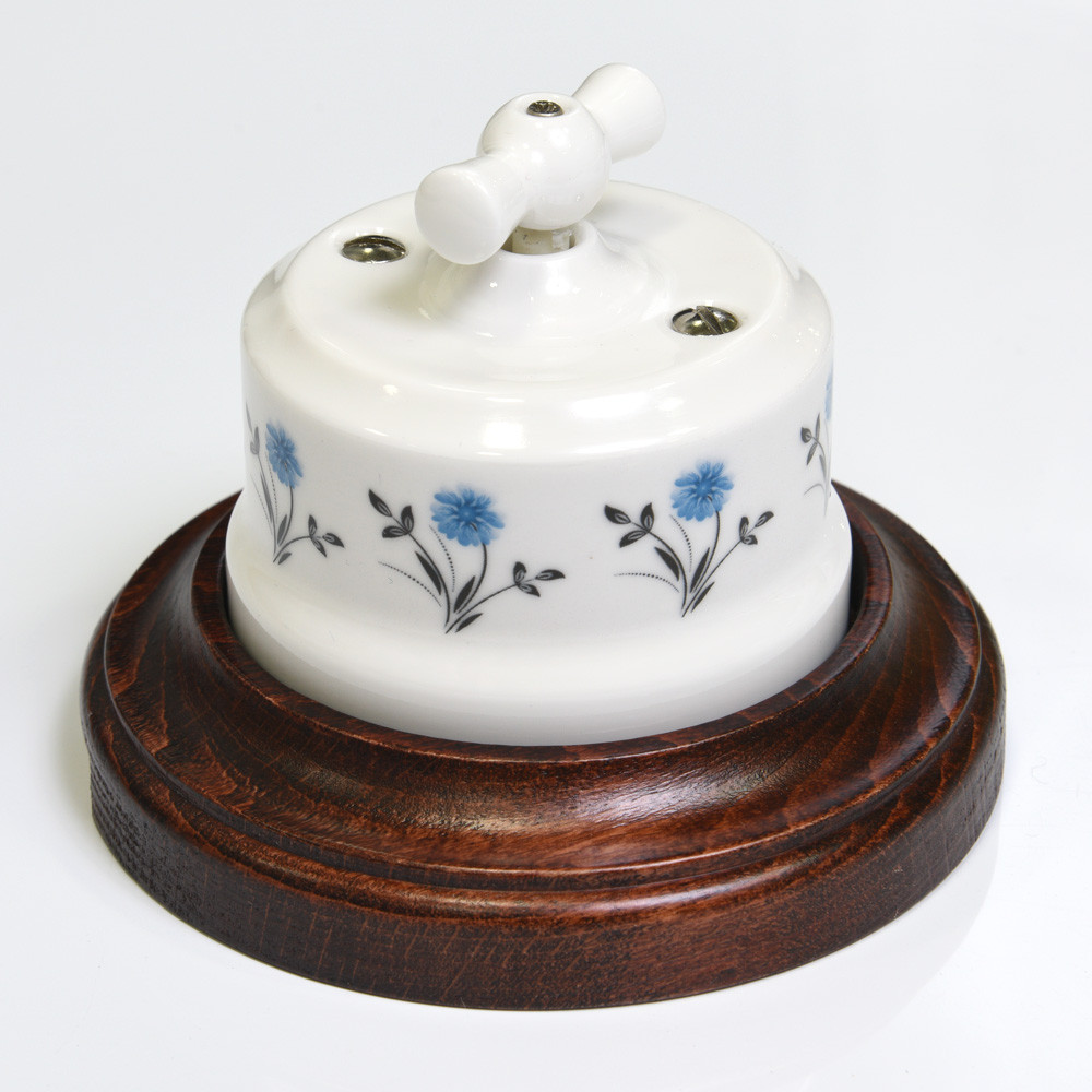 Выключатель из керамики украшенный деколью с орнаментом «Васильки». Приятный лаконичный рисунок оживляет интерьер, делая простые вещи немножко особенными. Узор надежно наносится на керамику отжиганием в печи при температуре 800 градусов, не стирается и не смывается.