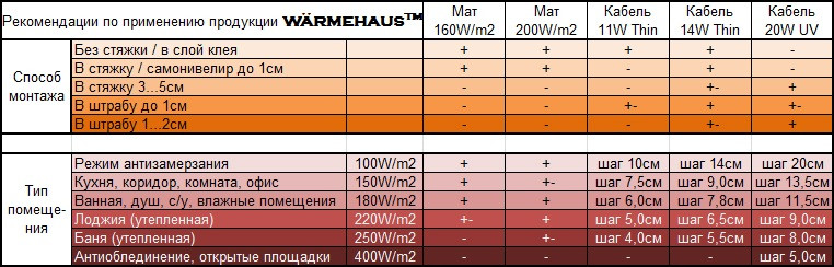 Выбирая ширину шага от 5 до 10см возможно добиться удельной мощности от 220Вт/м2 до 110Вт/м2,что решает любые задачи в жилых помещениях.