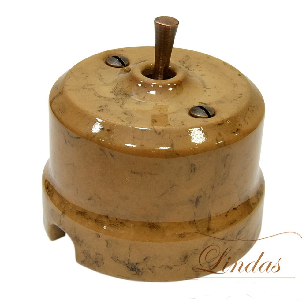 Перекрестный тумблерный Выключатель из керамики украшенный декором Капучино. Этот премиальный декор с имитацией структуры камня наносится мастером вручную, а керамика два раза обжигается в печи для закрепления цвета. Конечно, такие выключатели стоят дороже, зато, благодаря своей фактурности, в подходящих интерьерах они будут смотреться очень красиво.